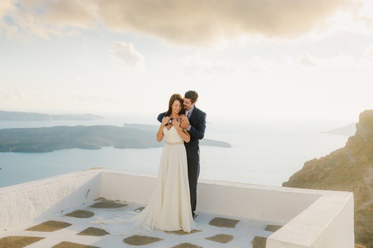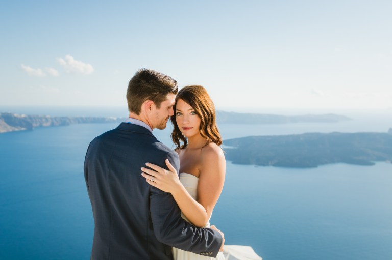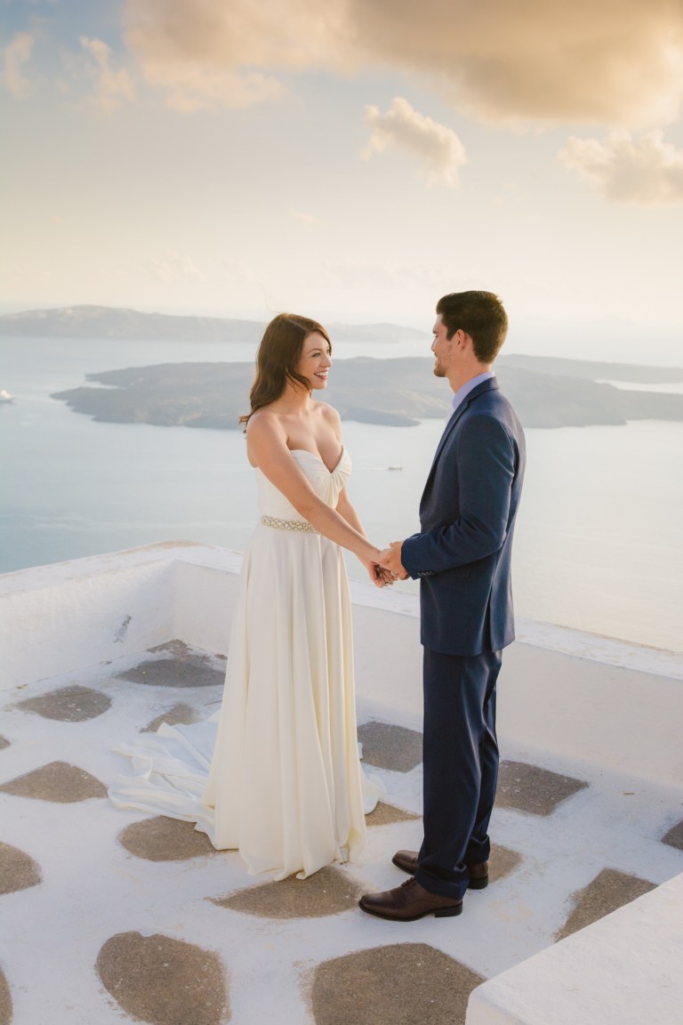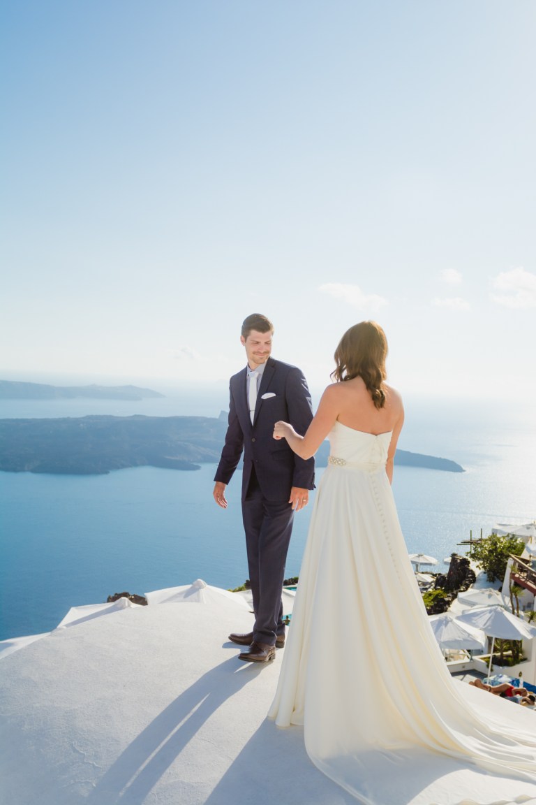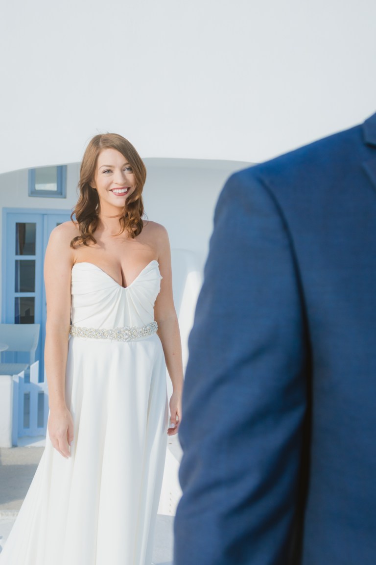 I’m glad I was a part of their elopement journey. I had the opportunity to see their eyes and hearts light up in their first look. It was amazing how much trust I got from the couple to capture the intimate moments. While Mark was waiting on the roof Zenith Blue Hotel in Imerovigli (http://zenithblue.gr/) I helped Ashley with the dress. When I got to the roof it was a signal to Mark – it was time. He turned away just to see his beautiful bride in front of him seconds later.