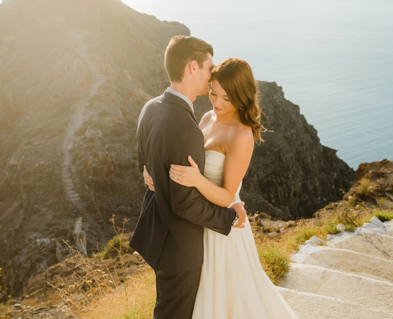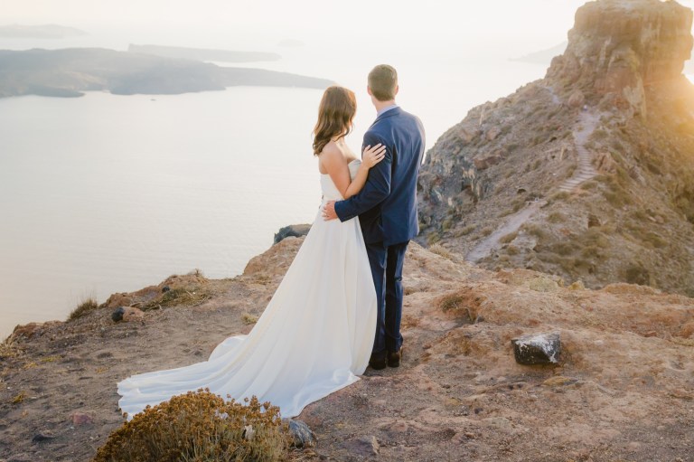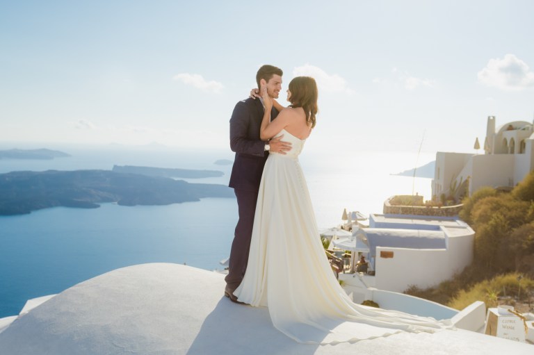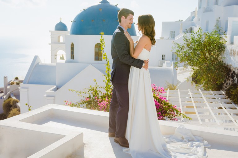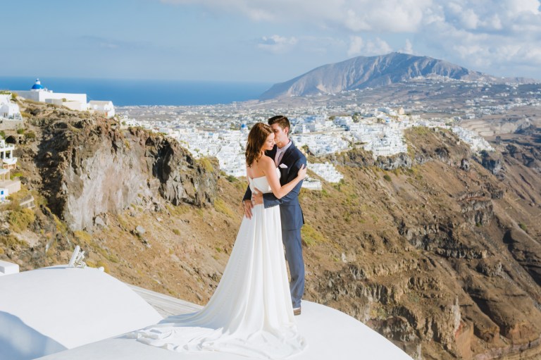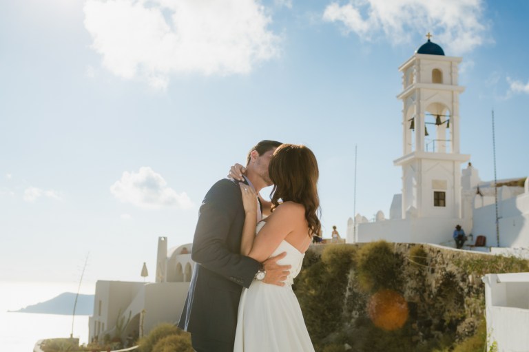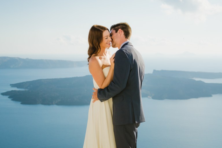 I’m glad I was a part of their elopement journey. I had the opportunity to see their eyes and hearts light up in their first look. It was amazing how much trust I got from the couple to capture the intimate moments. While Mark was waiting on the roof Zenith Blue Hotel in Imerovigli (http://zenithblue.gr/) I helped Ashley with the dress. When I got to the roof it was a signal to Mark – it was time. He turned away just to see his beautiful bride in front of him seconds later.