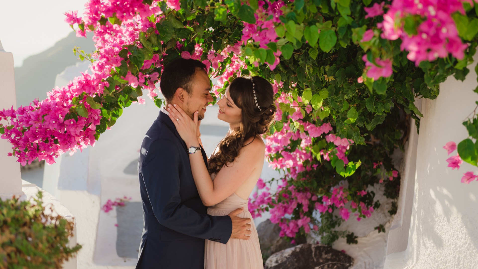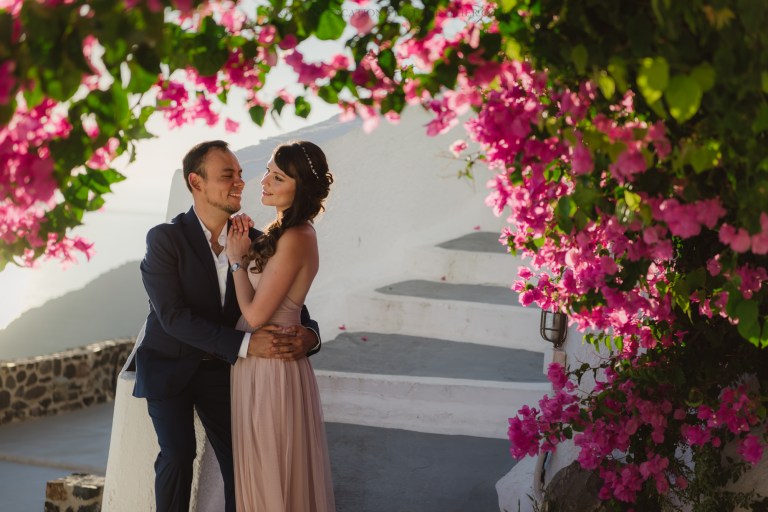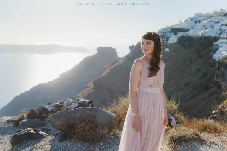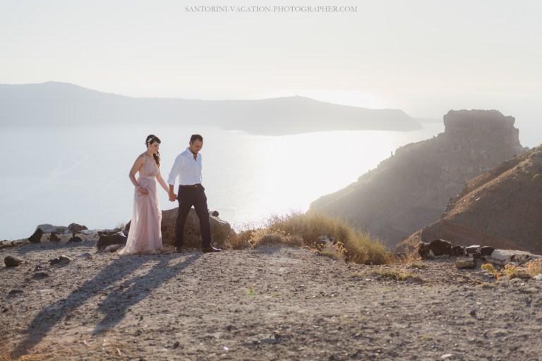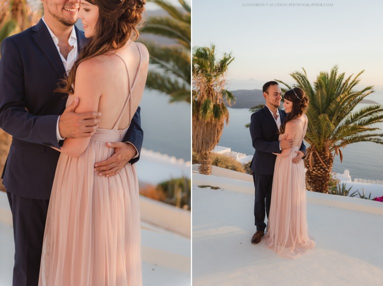 We waited for Santorini to do its thing and offer us a marvelous sunset. And it did. When the magic hour struck, it all clicked into place – her pastel dress, his loving look their body language.