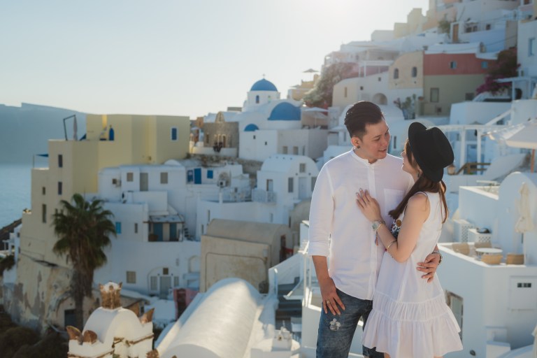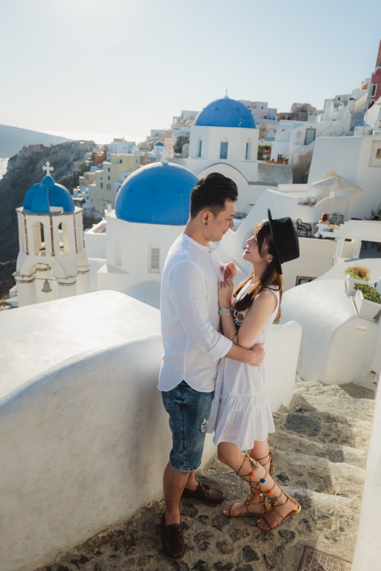 The other day I met the nicest couple from Singapore – Andy and Christy. who were looking to capture their special bond through a Santorini photoshoot. As soon as we met in Oia, it was clear that their connection was something truly special. We spent the afternoon exploring the beautiful sights of Santorini, and made our way to Imerovigli for a breathtaking sunset shoot.