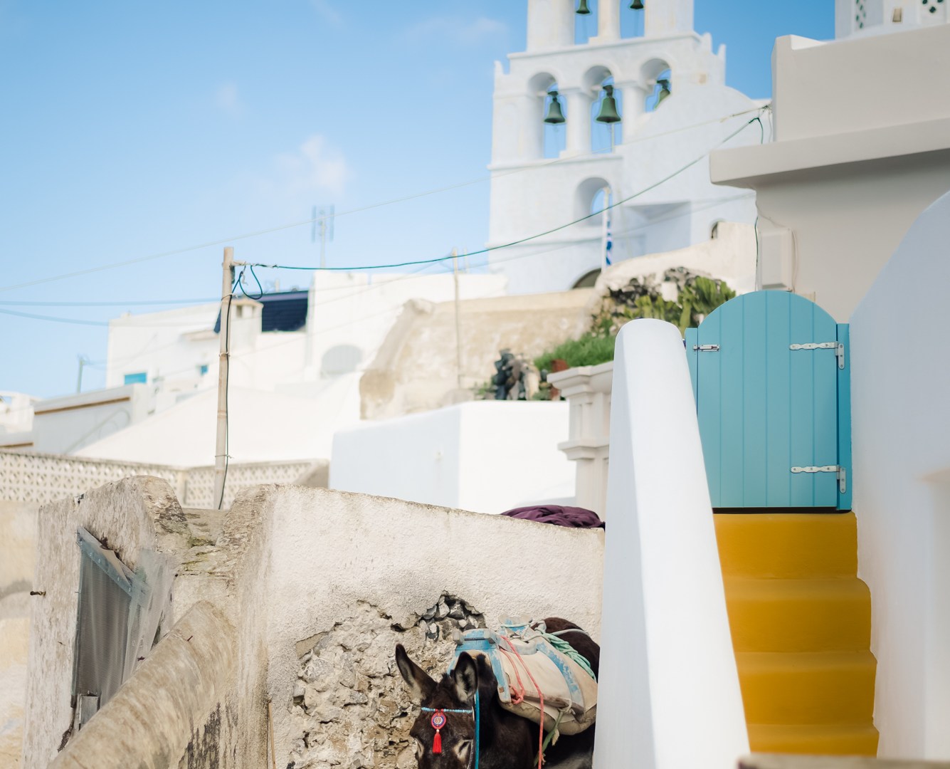 A photo of a donkey in the Pyrgos village by Anna Sulte, photographer on the island of Santorini.