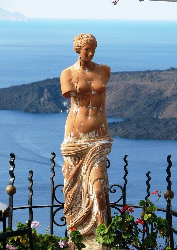 But you don’t have to visit the Louvre to admire the beauty of Aphrodite. Right here, in Santorini, we have our own little version of the famous sculpture! With caldera and the volcano in the background, it welcomes visitors to Fira, the capital town of Santorini. And it almost never says “no” if you ask to take a selfie! Apart from being made out of clay and measuring over a foot shorter, it is an exact replica of the statue of the Greek goddess of love and beauty. And you don’t need to spend 2 hours waiting in line to get into the famous French museum!