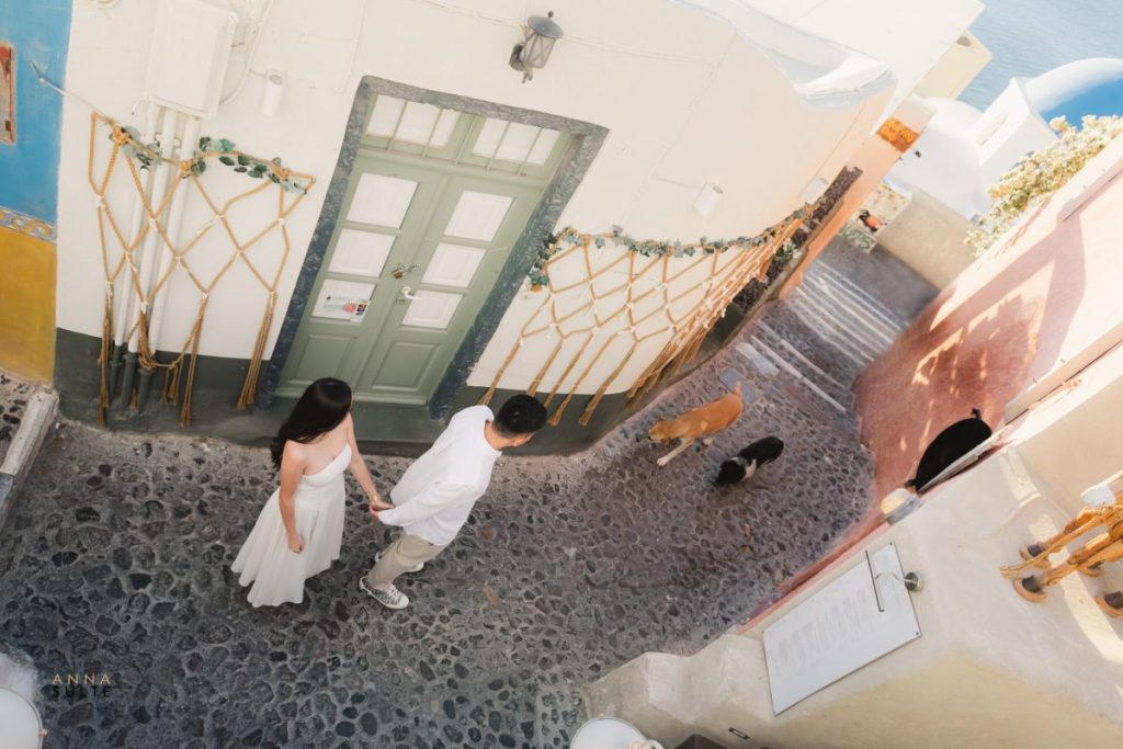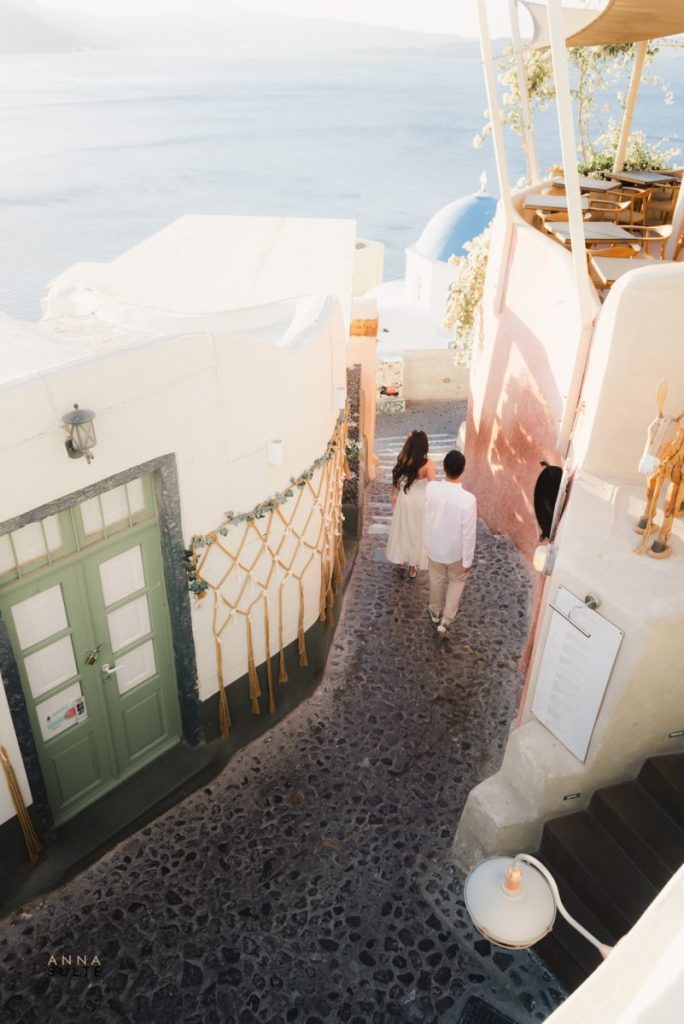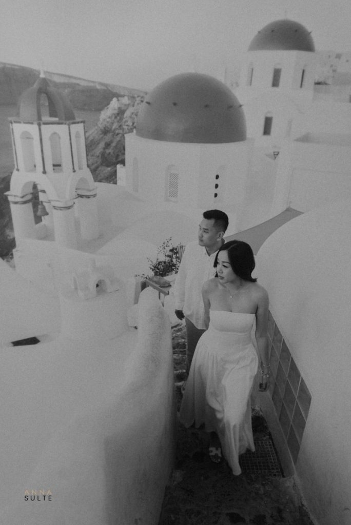 When we met them early that morning, the streets of Oia were still and peaceful, kissed by the first light of dawn. Lyna looked radiant in a flowing dress that seemed to dance with the morning breeze, while Vincent, ever the gentleman, stood by her side. We strolled through the winding cobblestone alleys and time to time we paused by blue-domed churches to take our sunrise photos.